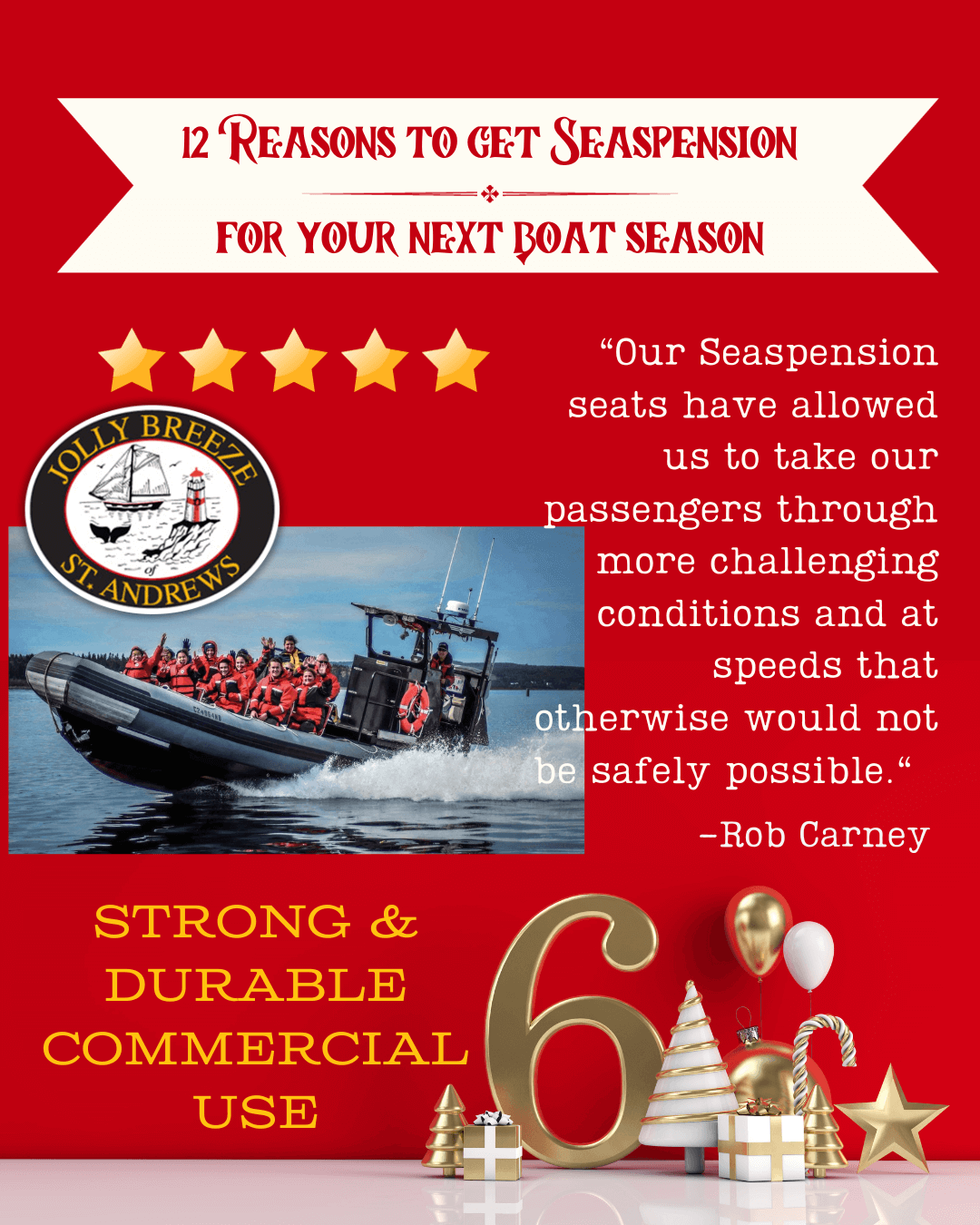 Rob Carney from Jolly Breeze in St. Andrews, Canada, acknowledges the strength and durability of Seaspension seats, making them ideal for commercial use. Seaspension ensures your passengers' safety and comfort even in challenging conditions.